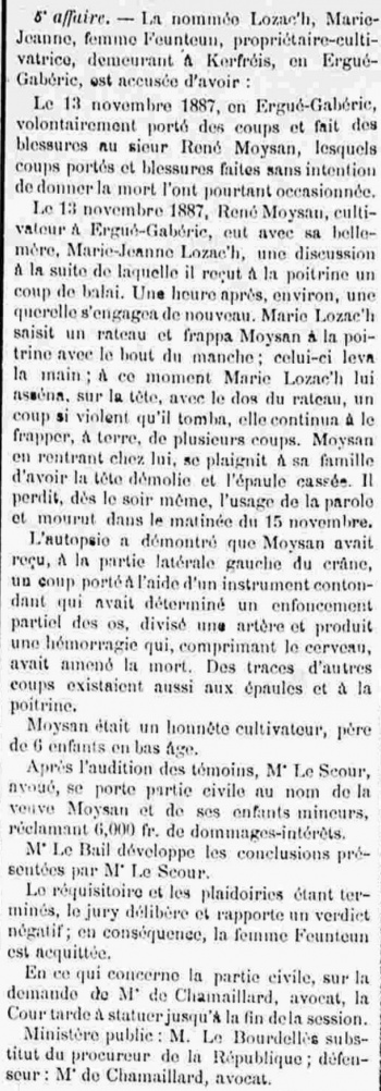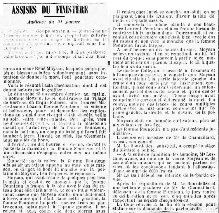 | Une affaire de coups mortels portés sur un homme par une femme devant la cour d'assises du Finistère : acquittement de l'inculpée Marie-Jeanne Lozac'h, femme Feunteun, mais paiement de dommages et intérêts à la veuve Moysan.