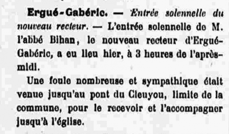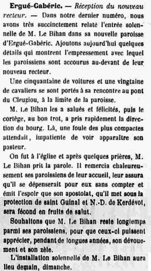 Ergué-Gabéric. - Réception du nouveau recteur - Dans notre dernier numéro, nous avons très succinctement relaté l'entrée solennelle de M. Le Bihan dans sa nouvelle paroisse d'Ergué-Gabéric. Ajoutons aujourd'hui quelques détails qui montrent l'empressement avec lequel les paroissiens sont accourus au-devant de leur nouveau recteur.