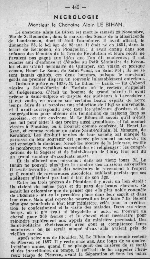 Le chanoine Alain Le Bihan est mort le samedi 29 Novembre, fête de S. Houardon, dans la maison des Sœurs de la Miséricorde de Landerneau, dont il était aumônier. Il avait atteint, le dimanche 23, le bel âge de 93 ans. Il était né en 1854, dans la ferme de Kernonen, en Plougoulm ; il avait connu dans son enfance des témoins de la Grande Révolution et leurs récits ne l'avaient pas gagné aux idées que l'ont dit modernes ; il eut comme ami d'enfance et d'études au Petit Séminaire de Kéroulas et au Grand Séminaire de Quimper, son voisin et presque cousin, Henri Le Sann, de Saint-Venal, en Saint-Pol ; ils ne sont jamais quittés, ces deux hommes, puisque le survivant garda au premier disparu un souvenir inlassablement entretenu.