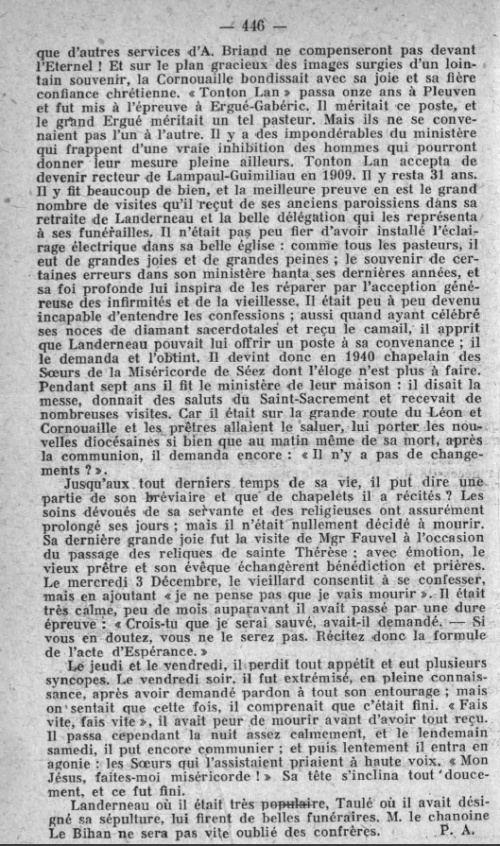 Landerneau où il était très populaire. Taulé où il avait désigné sa sépulture, lui firent de belles funéraires. M. le chanoine Le Bihan ne sera pas vite oublié des confrères.