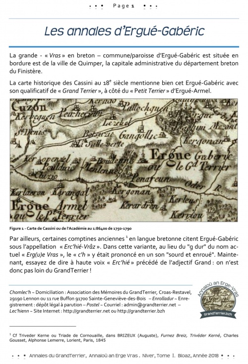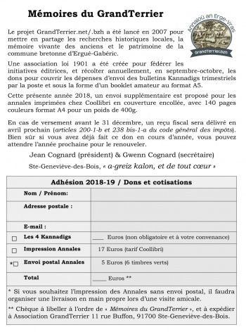 | Les annales sont par définition une revue à fréquence annuelle, dont le premier numéro est diffusé dès octobre 2018, en complément des billets hebdos et des chroniques trimestrielles « Kannadig ». Vous trouverez ici la présentation de ce premier numéro de 140 pages, avec la possibilité de télécharger le fichier pdf et/ou de choisir un élément du sommaire pour l'afficher directement. Le présent numéro n° 1 fait 140 pages couleurs format A4, couverture incluse. Il est imprimable à la demande, moyennant l'envoi du prix d'impression fixé à 17 euros (hors frais d'envoi) à l'adresse de l'association GrandTerrier : vous pouvez vous servir du bon de commande inclus ci-dessous. Le jeu-questionnaire de la 4e de couverture est également transcrit en fin d'article pour y jouer en ligne : le premier qui répondra correctement aux questions sera récompensé par un envoi gratuit de l'exemplaire papier. |