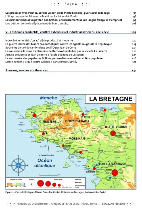 Lorsque l'idée de marquer les 10 ans du site GrandTerrier a germé, on a tout de suite pensé à éditer un almanach, avec comme support le calendrier des saints celtiques et bretons qu'on avait concocté en 2008. Mais, après discussions, d'aucuns nous ont dit que c'était légèrement vieille France et qu'il y avait mieux à faire que de renouveler l'échec de l'« Almanak Breizh Izel » de Luzel et Gaidoz en 1872. On a alors creusé les contours du projet : publication renouvelée annuellement, tirage professionnel de 100-200 pages grand format, monographie d’histoire et mémoire de la commune et de ses villages, mélanges universitaires ou miscellanées Le plan retenu pour les annales suit un découpage chronologique des grandes époques qui ont marqué l'histoire de notre commune :