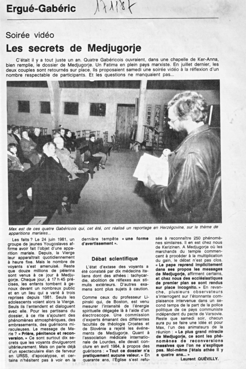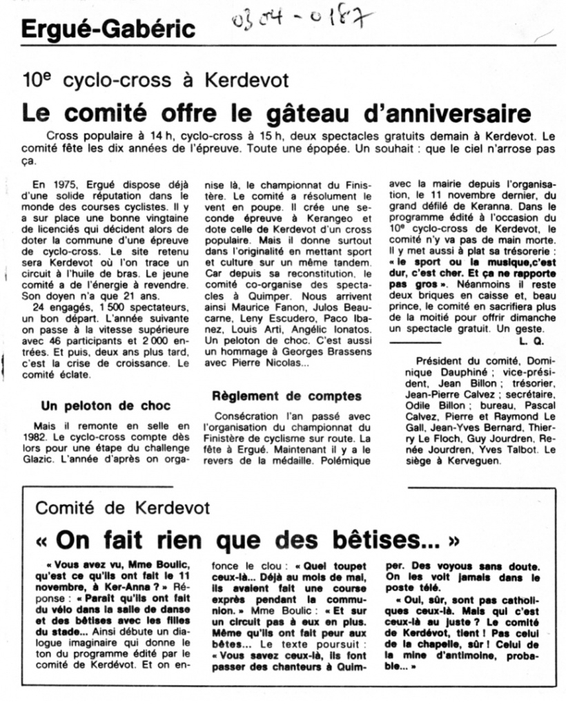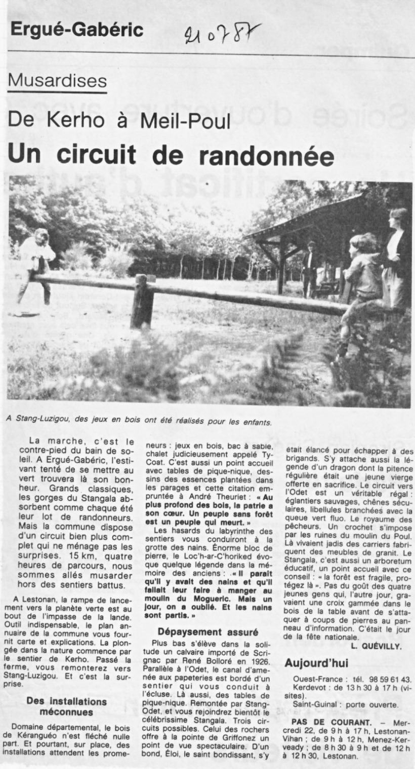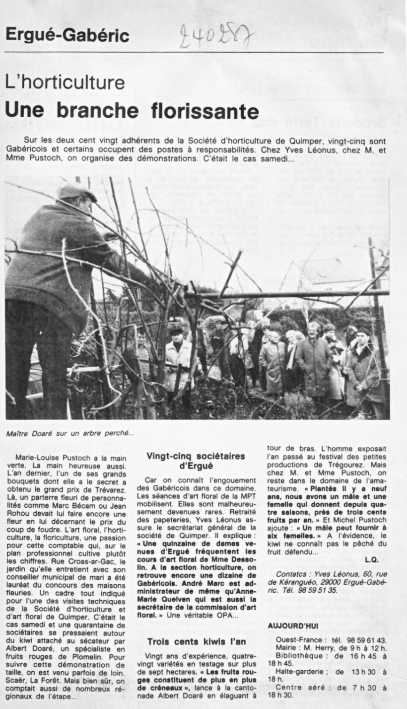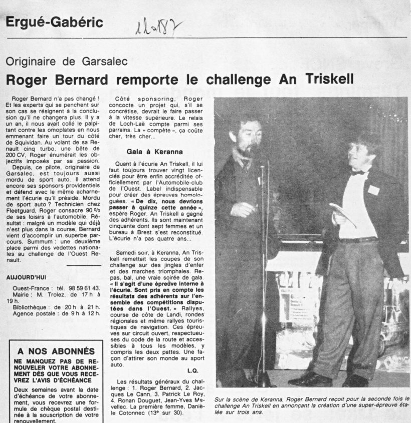 | Le 3 et 12 janvier, le 24 février 1987, le 1er juin, le 21 juillet, les 18 et 29 octobre, le 17 novembre, paraissaient dans les colonnes du Ouest-France des articles de Laurent Quevilly sur les activités sportives, notamment le cyclo-cross, le vélo, l'horticulture, la marche, la lecture, le foot ...