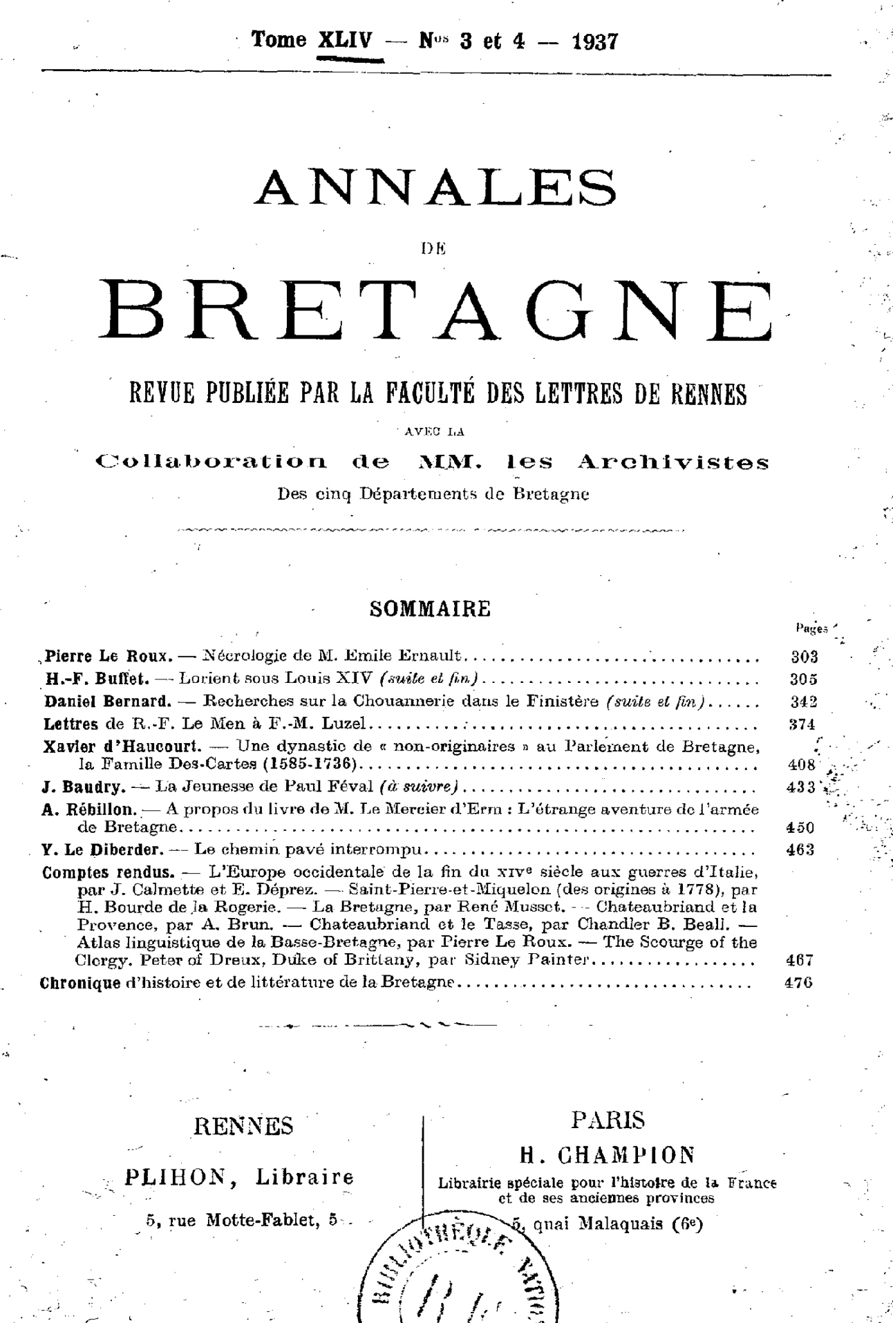 Ces 52 pages sur la chouannerie bretonnes constituent un complément à la précédente étude de 1910-11 de Paul Peyron sur la chouannerie dans le département du finistère.
