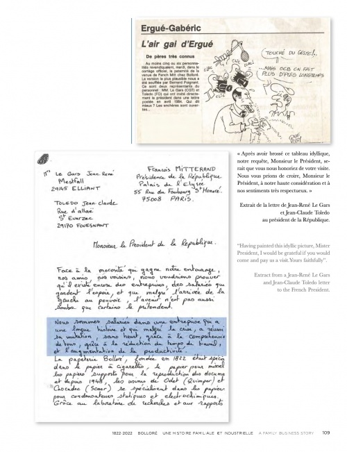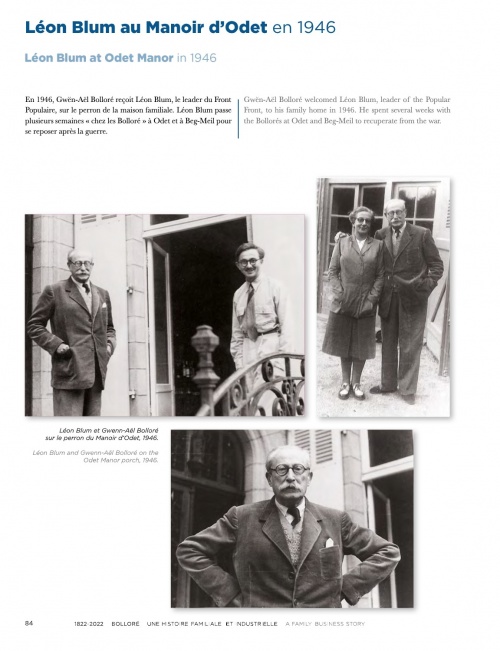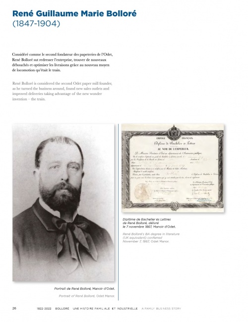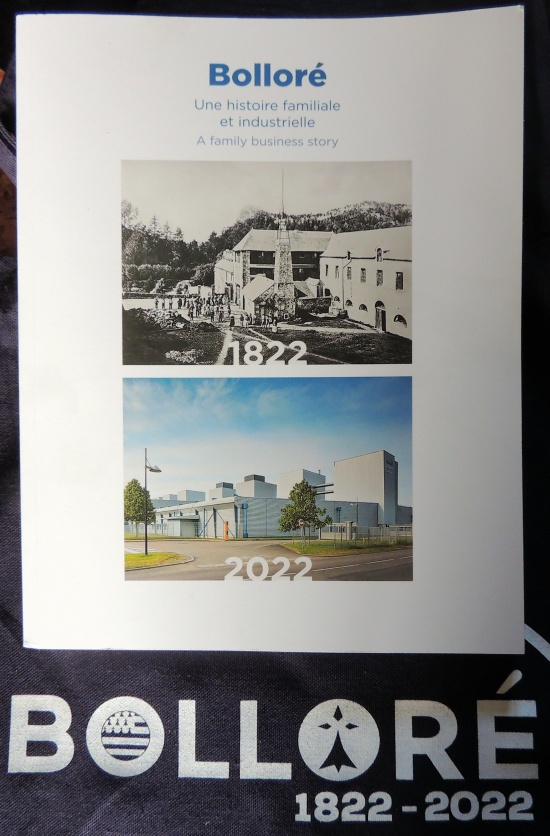Ce livre de 148 pages, avec textes bilingues français-anglais, nombreuses illustrations et documents d'archives commémorant le bicentenaire de l'entreprise familiale, a été distribué à tous les invités de la fête du bicentenaire à Odet le 17 février 1922, et mis en ligne sur le site Bollore2022.com. Certes la vraie plaque inaugurale de la première pierre du moulin à papier indique la date du 19 février De nombreux sujets et évènements du livre ont déjà été traités sur le site GrandTerrier, mais on note toutefois de vrais pépites originales préparés et exposées dans le musée du 1er étage du manoir d'Odet (cf. ci-dessous les facsimilés de ces pages) :