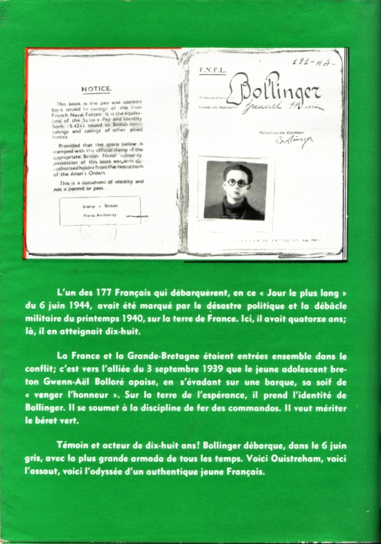Quant au débarquement du 6 juin 1944, voici le récit de celui qui était inscrit sous le nom de code Bollinger dans la liste d'appel du commando n° 4 du Bataillon des Fusiliers Marins du commandant Kieffer, page 129 et suivantes : « Serrer les dents et arriver ... Arriver ... La plage. Le sol semble monter, c'est bon signe. Soudain, une gerbe liquide à peine à un mètre : peut-être un obus de mortier. Heureusement, l'eau atténue les éclats ... Serrer les dents ... Voici la grève. »