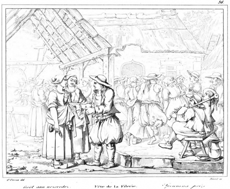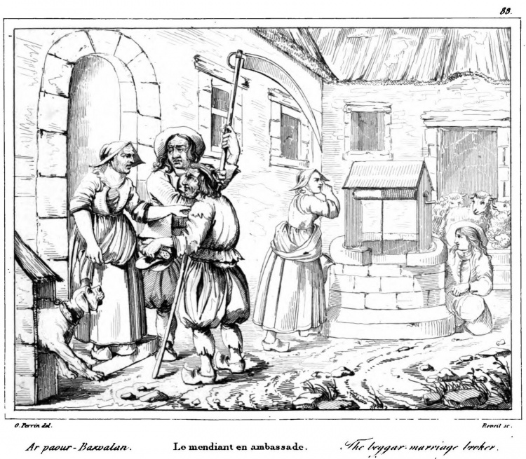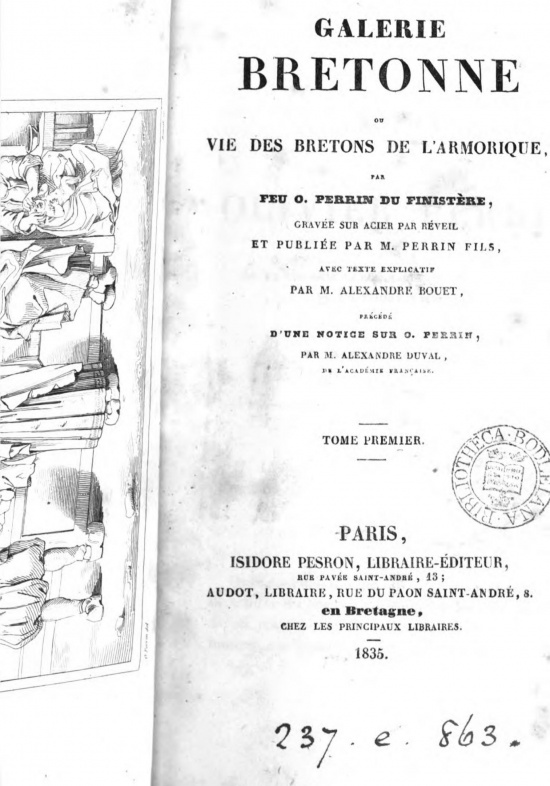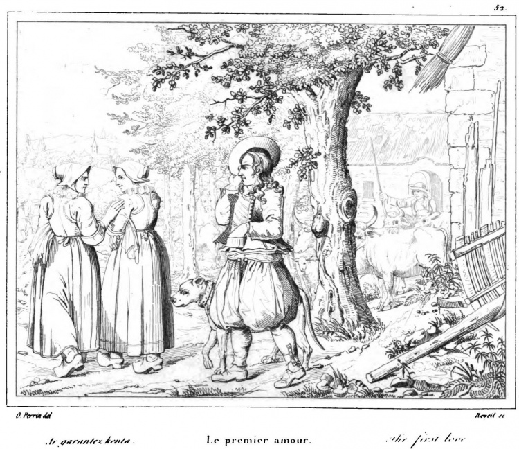 | Ouvrage essentiel et majeur du 19e siècle, celui d'Alexandre Bouët, Breiz-Izel ou la vie des Bretons d'Armorique, de 1838, illustré par le célèbre Olivier Perrin (originaire du Rostrenen révolutionnaire, devenu professeur de dessin à Quimper). Il s'agit, à travers l'itinéraire du jeune Breton Corentin, petit paysan en bragou-bras et au penn-bazh de rigueur (dès qu'il fut devenu pâtre en culotte vers ses cinq ans), comme tout un chacun alors au beau pays de Cornouaille, de suivre la vie quotidienne de la Bretagne rurale, d'étape en étape (baptême, premiers pas, confession, moisson, lutte, pardon, soule, veillée, repas de noce, etc...), dans une sorte de fresque rustique qui nous mènera de sa naissance à la mort du grand-père. Le trait est souvent rude, et le portrait peut être fort peu flatteur, mais n'était-ce pas la rudesse d'une population elle-même rude, voire dure (dixit Yves Le Gallo), et les traits d'une civilisation paysanne, à la fois celtique d'origine et catholique d' inspiration, aux antipodes mêmes des moeurs d'un journaliste bourgeois, comme l'était A. Bouët ? Sa conclusion est éloquente : "Nous avons montré dans Corentin, son père, son grand-père et ceux qui les entouraient, le paysan breton à tous les âges et sous toutes les faces ; c'est un tableau complet de sa vie domestique. Puissent les idées d'amélioration que nous avons semées sur notre route porter un jour leurs fruits ! Mais surtout, en poliçant ce peuple, qu'on se garde d'altérer sa noble et forte nature ! Plutôt que d'en faire quelque chose qui ressemble à ce type de dépravation précoce qu'on appelle Gamin de Paris, ou à ces populations gangrenées des villes qui n'ont d'autre croyance et d'autre frein que le tribunal correctionnel, ah! qu'on respecte son ignorance et sa virginité ! Les fausses lumières sont pires que l'ignorance car, au lieu de guider, elles égarent !" (p. 344)