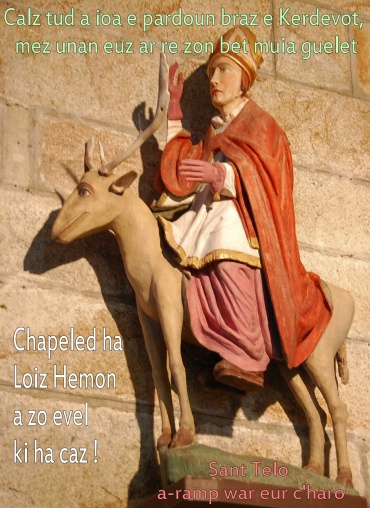 La légende rapporte qu’un seigneur offrit à l’ermite Télo les terres qu’il pourrait enclore en une nuit, avant le chant du coq ; le saint se servit d’un cerf comme monture pour délimiter son nouveau territoire.