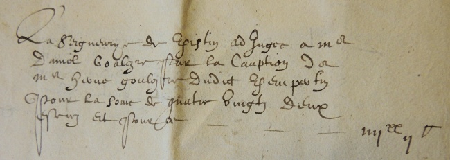 « La seigneurie de Keristin adjugée à maistre Daniel Goalezre par la cauption de maistre Hervé Goarezre dudict Kempertin pour la somme de quatre vingtz deux escuz et pour ce - - - IIIIxx II [é] »