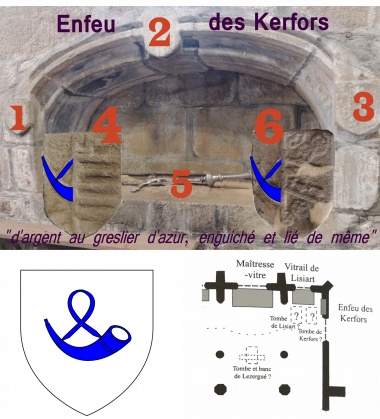 Et sur cette tombe il y a six blasons familiaux, dont deux ont des motifs conservés, avec en partie « senestre » (gauche) le mi-parti du fameux cor de chasse ou « greslier » de couleur azur des Kerfors du 15e au 17e siècle, et en partie « dextre » (droite) des armes de familles en alliance non encore identifiées.