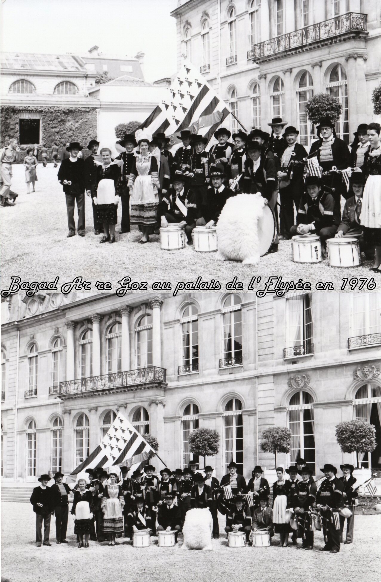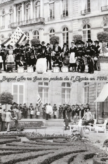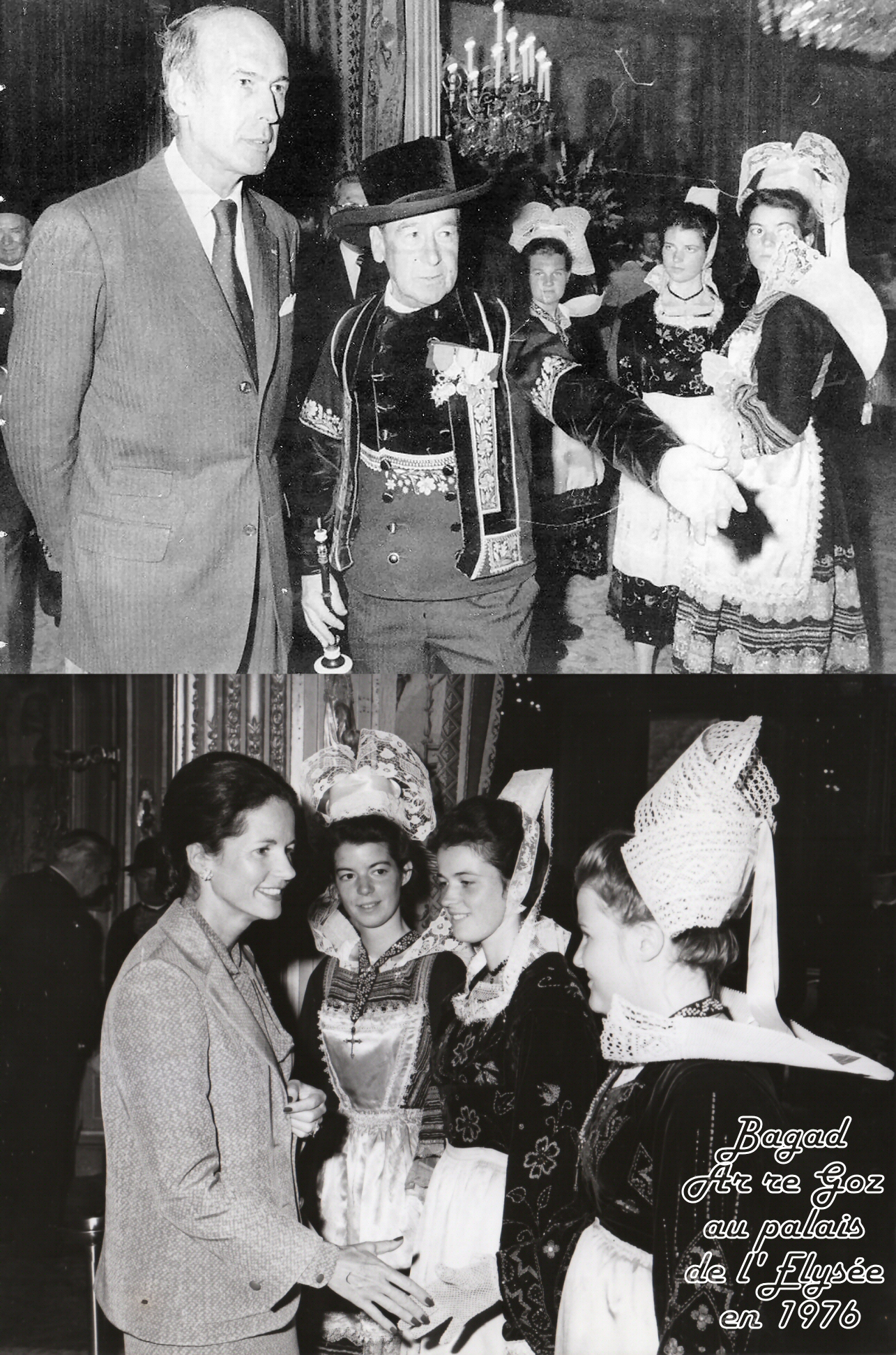 Et enfin six photos d'un studio parisien où l'on voit les membres du bagad « Ar Re Goz » en costumes traditionnels, invités au palais de l’Élysée par M. et Mme Giscard d'Estaing pour le 14 juillet 1976. On y reconnait entre autres le penn-talabarder gabéricois Pierre Roumégou, mais qui nous dira qui sont les 20 autres musiciens retraités et les 3 jeunes belles filles aux trois coiffes différentes ?