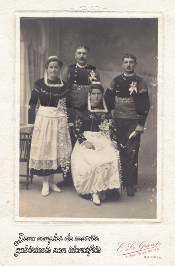 Deux couples de mariés, tous les quatre en habits bretons photographiés par Etienne Le Grand, et où les deux frères arborent une discrète moustache. Ne les ayant pas encore identifiés, un appel est lancé, au travers du concours initié il y a quelques mois « 1880-1940 - Les plus beaux couples gabéricois en costumes bretons », pour leur donner noms, prénoms, dates, lieux de vie ...