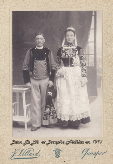 Une photo du couple formé par Jean Le Dé de Boden et de Josephe Nédélec de Lezergué, photographiés en 1911 par Joseph-Marie Villard. La mariée est la tante de celui qu'on surnommait Jean Lezergué, dernier « chatelain » agriculteur du manoir du même nom.