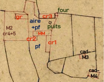 La crèche au nord (cf code cr3) fait la limite de l'aire à battre et d'un deuxième « pors à frambois ». Du côté du levant on a un puits (la margelle a été déplacée récemment) et un four à pain (un beau four est visible aujourd'hui plus au sud à l'entrée du corps de ferme.
