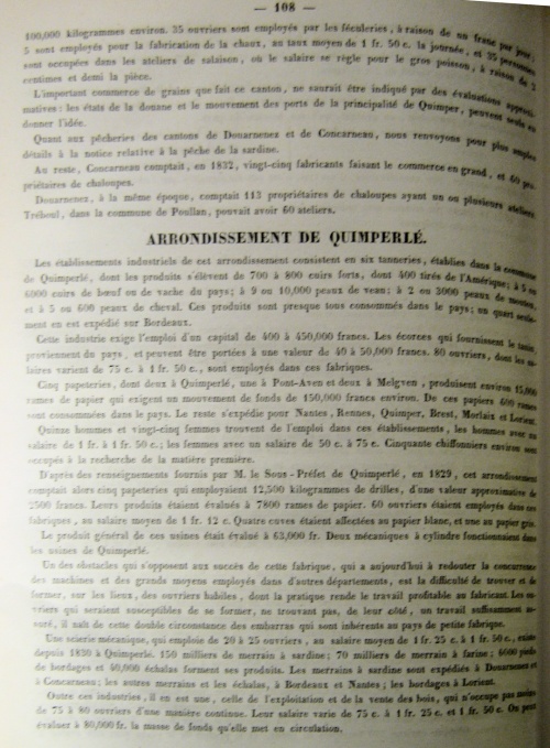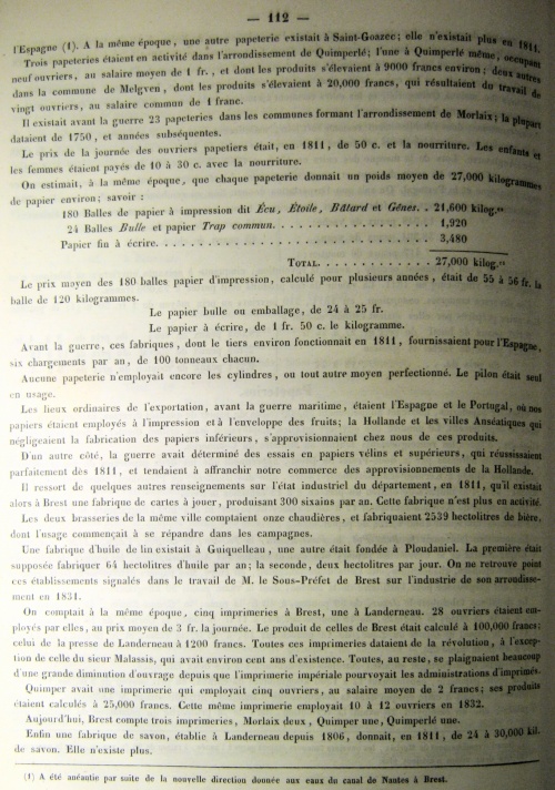 Arrondissement de Morlaix. Papiers. Des renseignements fournis au Ministre du Commerce, en 1829, sur l'état de cette industrie, apprennent qu'il y avait, à cette époque, vingt-et-une papeterie dans l'arrondissement de Morlaix. Leur produit général était évalué à 41,766 rames de papier, dont les 6/10 en papier d'emballage, du prix de 60 francs les 100 kilogrammes ; 3/10 en papier gris-noir commun, du prix de 45 francs les 100 kilogrammes ; et 1/10 papier commun blanc, pour écriture, du prix de 100 francs les 100 kilogrammes.
