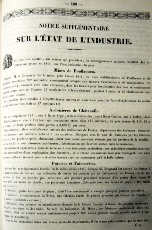 Les détails adressés par le Sous-Préfet de Brest, apprennent que les deux papeteries de son arrondissement, l'une située à Kerinou (Lambézellec); l'autre, dite des Justices, en Plouédern, consommaient, à cette époque, 90 à 100 milliers de chiffon du prix de 6 à 15 centimes la livre.