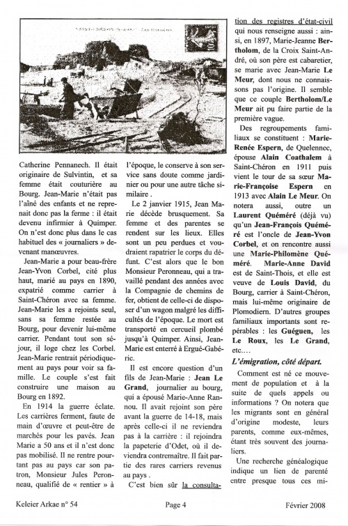 - « Un examen des villages d'origine montre qu'il y a eu une propagation de l'information et, par suite, de départs, à partir principalement d'une zone en forme de courbe, qui va approximativement de Crec'h-Ergué à Kerdilès ... Une autre zone de départs est repérable au voisinage de la papeterie (Odet-Quélennec) et aussi au bourg ... Le "bouche à oreille" a dû fonctionner entre les hameaux voisins. »