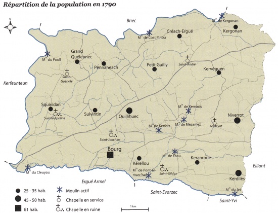 - La citation du géographe Ogée introduit la notion de tenures et de mouvances via la dépendance vis-à-vis du seigneur évêque de Quimper : « La paroisse relève du roi, à l'exception des trois à l'exception des trois villages