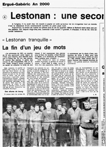 | Le 5 mars 1987, paraissait dans les colonne d'Ouest-France la quatrième pleine page d'une série, écrite et coordonnée par Laurent Quevilly, dont l'objectif était de dresser une photographie des évolutions économiques et sociales de la commune.