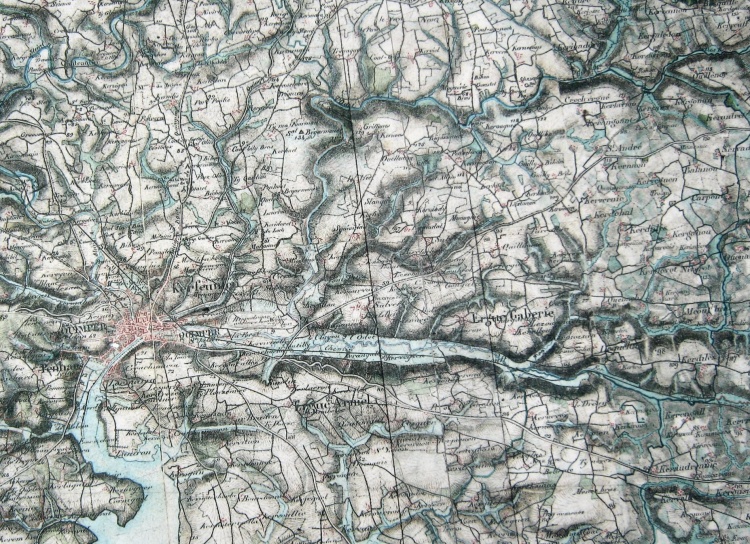 Et enfin un détail qui confirme une datation légèrement tardive par rapport aux premières versions des cartes d'état-major : le tracé de la ligne de chemin de fer desservant Quimper y apparaît. La ligne en question fut ouverte et inaugurée en 1863. |