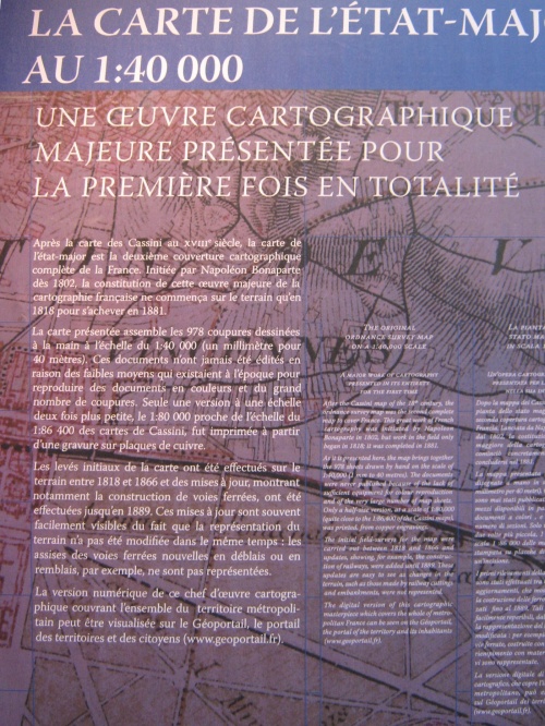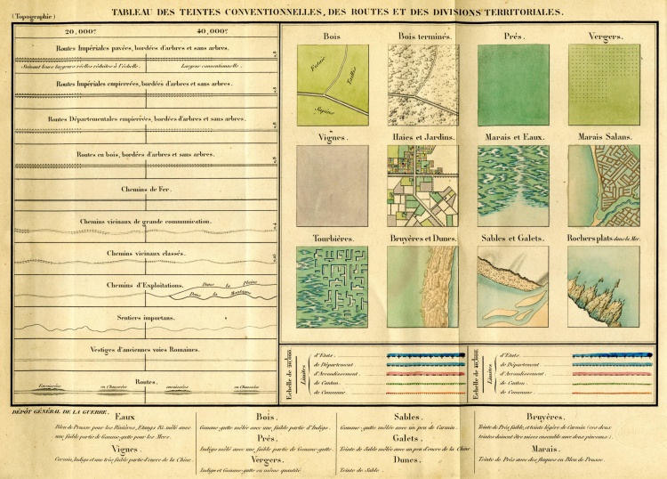 - Une ordonnance royale de 1827 confie l'exécution d'une Carte d'Etat-Major au Dépôt de la Guerre même si des premiers essais eurent lieu dès 1818. Cette carte peut être vue comme succédant à la carte de Cassini dont l'absence de mise à jour devenait une gêne de plus en plus grande. Les levés furent réalisés au 1/40 000, mais les minutes restèrent manuscrites ; elles étaient accompagnées d'un calque des courbes de niveau, à équidistance moyenne de 20 m (10 m en plaine, 40 m en montagne), tracées à l'aide de mesures rudimentaires, destinées seulement à guider les graveurs dans la figuration du relief par des hachures. Source : Wikipedia. [Ref.↑]
