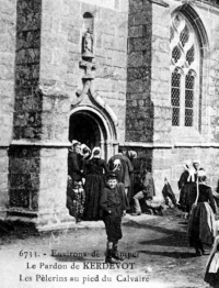 Photographe et éditeur : Joseph-Marie Villard, Quimper. Libellé : Environ de Quimper - Le Pardon de KERDEVOT - Les Pèlerins au pied du Calvaire. Datation : avant 1916. Circulation : un exemplaire écrit et ayant voyagé en 1916 ;