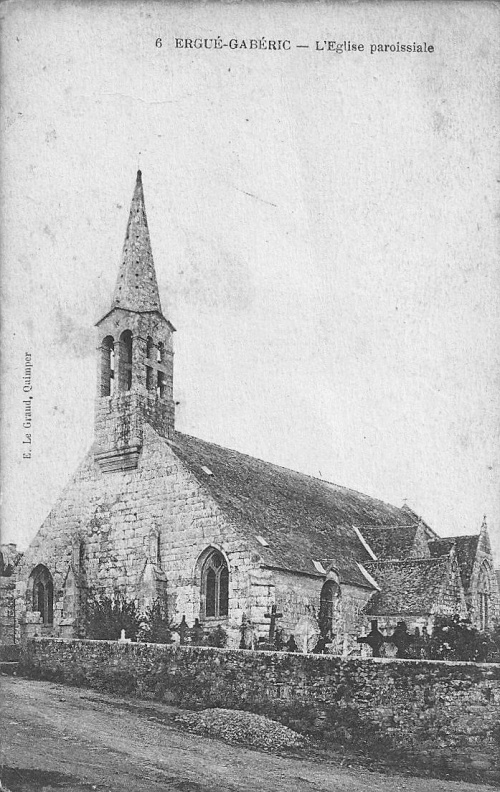 Est-ce la plus ancienne carte postale représentant le bourg d'Ergué-Gabéric, orthographié ici Gabérie ? Nous en sommes presque sûrs car cette carte postale date d'avant 1906 (cf. détails ci-dessous). D'autres cartes postales signées Etienne Le Grand représentant l'église paroissiale (cf fin d'article) pourraient être candidates, mais le photographe d'origine gabéricoise ne signait ses cartes postales de son nom qu'après 1920. À noter qu'à ce jour, la plus ancienne carte postale gabéricoise est celle du pont de Meil-Poull au Stangala dont nous disposons d'un exemplaire affranchi le 24.09.1902 (Cartes postales du moulin de Meil-Poul au Stangala). |