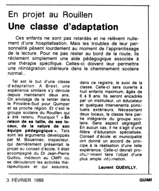| Le 3 février, le 2 mars 1988 paraissaient dans les colonnes du Ouest-France des articles de Laurent Quevilly sur la vie dans les écoles sur le territoire communal.