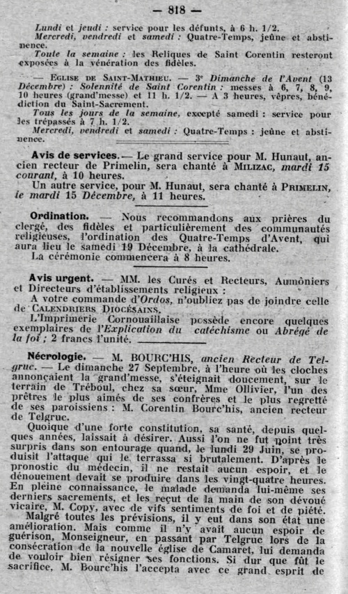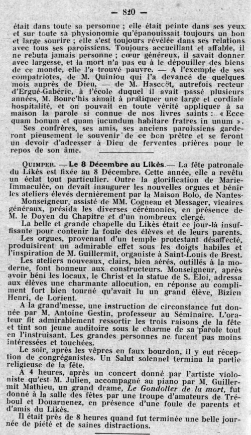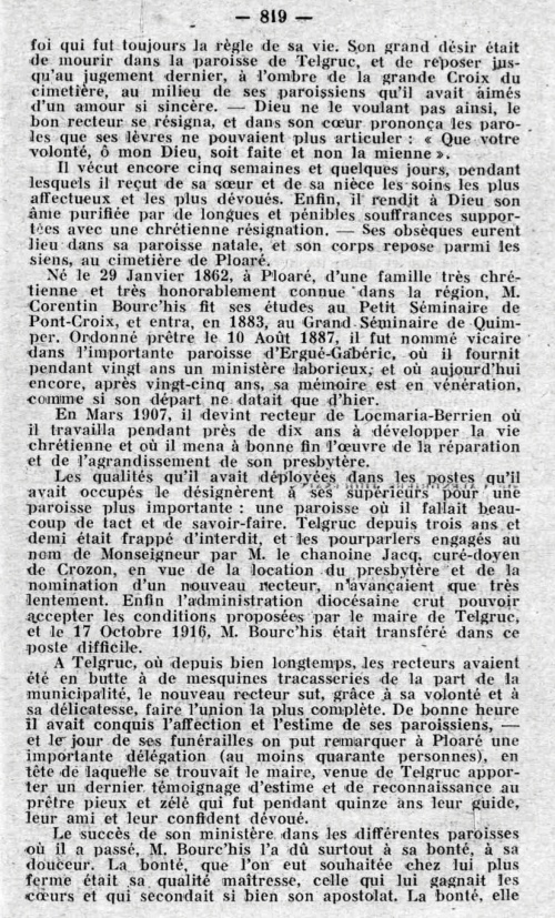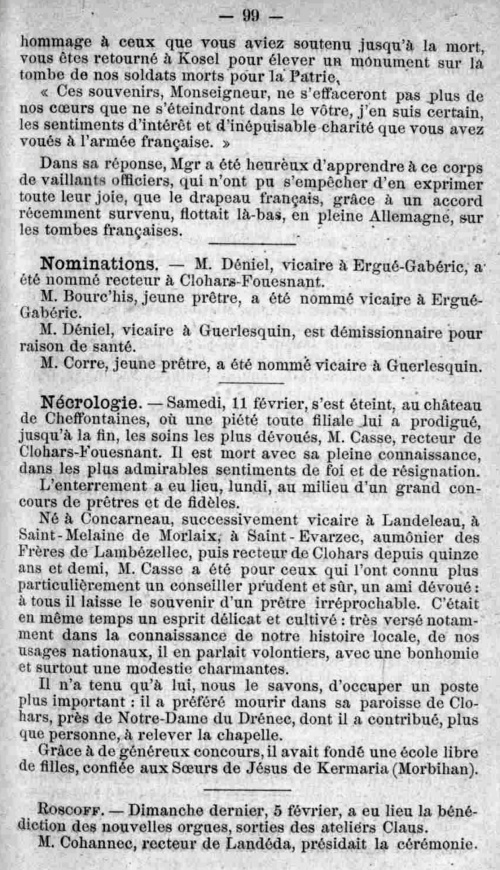 Nominations du 18 février 1888: « M. Déniel, vicaire à Ergué-Gabéric, a été nommé recteur à Clohars-Fouesnant. M. Bourc'his, jeune prêtre, a été nommé vicaire à Ergué-Gabéric » Nécrologie : « Ordonné prêtre le 10 août 1887, il fut nommé vicaire dans l'importante paroisse d'Ergué-Gabéric, où il fournit pendant vingt ans un ministère laborieux ; et où aujourd'hui encore, après vingt-cinq ans, sa mémoire est en vénération, comme si son départ ne datait que d'hier. » |