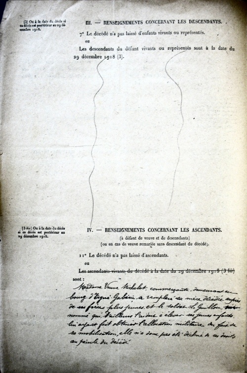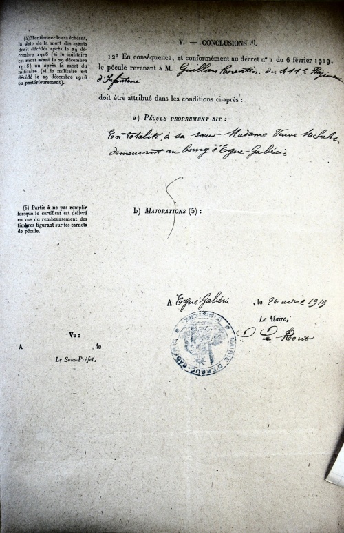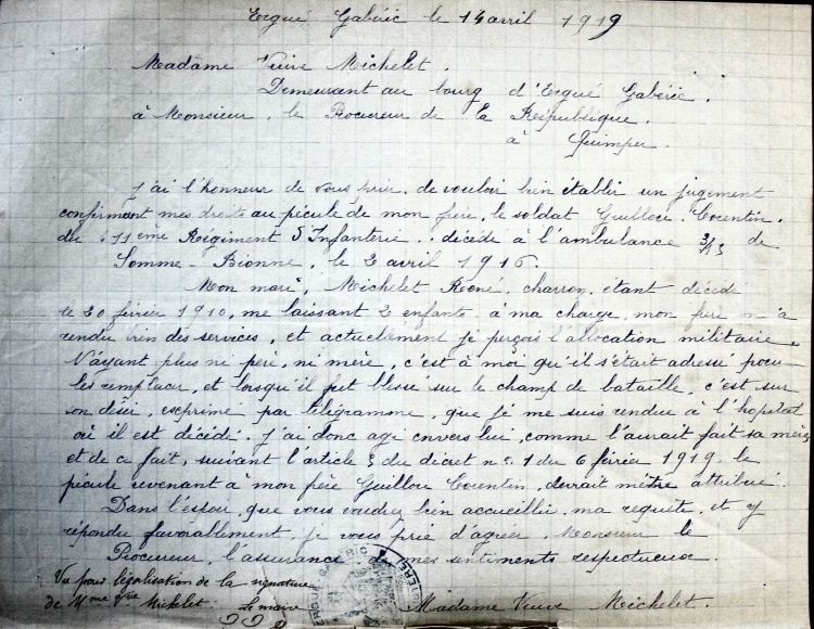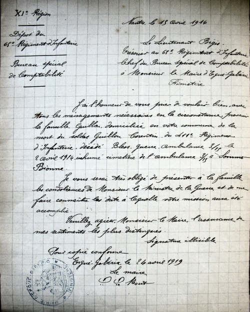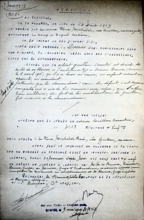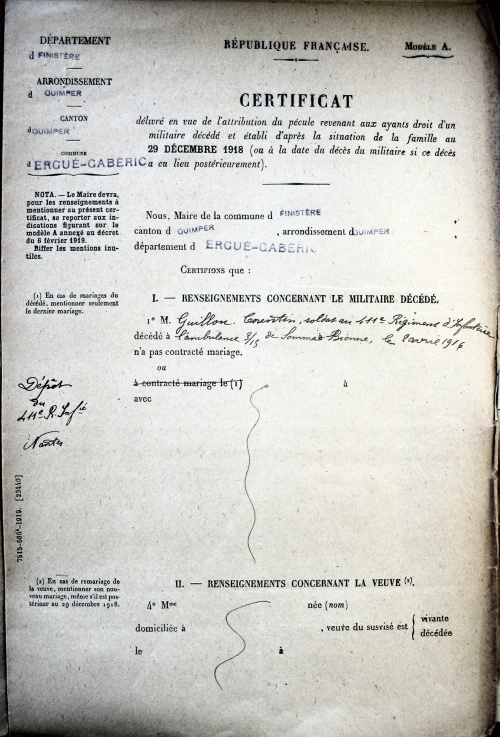 Compléments généalogiques : Corentin Guillou, son frère Yves (mort au front en 1914) et leur sœur Marie-Françoise Yves et Corentin considèrent comme leur mère leur sœur ainée, laquelle se marie avec un charron (Michelet) qui la laissera veuve et elle tiendra un commerce au bourg d'Ergué-Gabéric. Après les combats de Beauséjour les 10-11-12 janvier 1916, Corentin est hospitalisé à l'unité de soins de Somme-Bionne, « blessé sur le champ de bataille ». Il envoie un télégramme à sa sœur qui se rend sur place où il décède début avril. En 1919 Marie Françoise fait une demande pour être bénéficiaire du pécule |