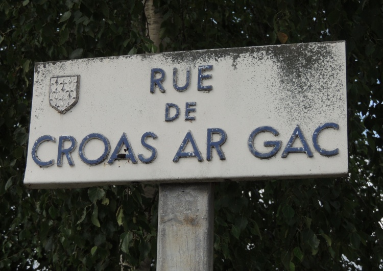Toponymiquement Croas ar Gac / Kroaz ar Gag est « la croix du dénommé Le Gac, surnom de quelqu'un qui parle mal ». Kroas pour "croix, calvaire" et Ar Gac, patronyme basé sur le quafilicatif gag "bredouilleur". Le calvaire est signalé sur le cadastre de 1834 : une croix sur la carte au milieu du carrefour et plusieurs parcelles nommées « Parc ar Groas ». Le lieu est aussi libellé Croas ar Gac et Groas ar Gac dans le « Tableau général des chemins ruraux » en 1837. Elle apparaît également sur la carte d'état-major établie dans les années 1920. |