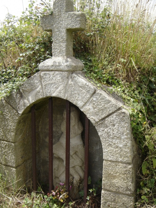 [modifier] 3.1 Une piéta convoitéeEncastrée dans un talus, la vierge de pitié de Kroas-ar-Gac d'environ un mètre de haut est conservée dans une niche de pierres fermée par des barreaux de fer, surmontée d'une petite croix de granit. La tête de la Vierge ne tient que grâce à une couche de ciment, et il ne reste du Christ que le tronc et les jambes. Malgré l’érosion du granit, le Père Y.P. Castel, visitant le site en août 2000, relève un contraste entre la position frontale, avec un léger mouvement de tête vers la gauche, et équilibrée de la mère et la cambrure du Christ aux proportions plus grêles comme pour accentuer la fragilité du corps du crucifié recueilli par sa mère. La piéta daterait du 16e siècle. La statue de la Vierge faisait partie autrefois d'un calvaire situé de l'autre côté du chemin de Stang-Odet. Marjan Mao qui habitait au bout du chemin se souvient y avoir vu au début du siècle les restes des premiers degrés du socle, ainsi qu'un magnifique if très proche. Le calvaire aurait été démoli au 19e siècle et les pierres utilisées pour la reconstruction du clocher de l'église paroissiale, abattu par la tempête du 9 février 1836. Mais les aventures de la Vierge de Kroas-ar-Gac ne s'arrêtèrent pas là. En 1926-27 René Beulz, propriétaire du champ en bordure duquel repose la statue, fut contacté par M. Charruel, beau-frère de René Bolloré le patron des usines d'Odet. Il lui demanda de transporter la statue dans les jardins du château de Stang-Venn. René Beulz, d’abord réticent, finit par accepter. Peu de temps après, survint une période de fort mauvais temps. Ceux qui avaient alors l’habitude de faire leurs dévotions en passant devant la pieta, demandèrent le rapatriement de la statue. René Bolloré fit remettre le pieux vestige en place au plus tôt. Il envoya ensuite deux de ses maçons, afin d’édifier une niche avec de solides barreaux pour protéger la vierge. |