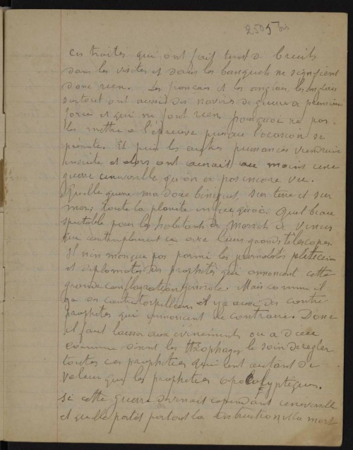 Ce que je trouve curieux dans cette guerre russo-japonaise, c'est que tout le monde dit que les Japonais sont très civilisés et, de plus, très humains, et on en dit autant des Russes. Eh bien, mais alors, pourquoi vont-ils se massacrer, et même tant faire endurer des misères effroyables aux populations des villes et des campagnes ? Est-ce pour avoir l'agrément de montrer ensuite leur humanité? S'ils ont tant d'humanité, et puisqu'ils ont réuni là-bas de nombreuses armées, ils feraient bien de les employer à détruire les bandits et les fanatiques qui infestent ces régions d'Extrême-Orient, alors ils feraient œuvre d'humanité, en débarrassant celle-ci de toutes ces bêtes féroces. Et puis après, cette œuvre accomplie, ils pourraient s'arranger à l'amiable au sujet de la Corée et de la Mandchourie. Et qu'importe aux populations de ces pays d'être gouvernés par l'empereur de Russie ou par celui du Japon, par le blanc ou par le jaune ! Et qu'importe à ces deux empereurs d'avoir à gouverner des centaines de millions d'individus, ils n'en seront que plus malheureux! Moi, je crois que le Prince de Monaco, qui n'a à gouverner que 12 500 habitants, se trouve mieux que tous ces rois et empereurs, et ses sujets également. Et le président de la République de Saint-Marin, avec ses 7 800 habitants, se trouve mieux que le président de la République des États-Unis avec ses 75 000 000 ; dans ces petits États, on n'entend jamais parler de guerre ni [de] révolution. Les contribuables, dans ces pays-là, ne doivent pas être bien grevés, puisqu'il n'y a ni armée, ni marine, ces fléaux et ces ruines des grandes puissances. Oui, puisque toutes les puissances sont en armes maintenant, et qu'elles veulent tuer du monde, elles devraient non s'amuser à tuer de braves et honnêtes gens, des jeunes gens espoir de l'avenir, mais les peuples sauvages, les Boxers, les Conguisses, les Tongas, les Apaches, les voleurs, les pickpockets, les bandits, les assassins, les cambrioleurs, les fanatiques et beaucoup d'autres bipèdes inutiles et dangereux. Après ça, on pourrait désarmer et proclamer la paix universelle. Et puis alors, la terre étant purgée de tous les bipèdes malfaisants, les hommes pourraient être placés dans les meilleurs conditions possibles, étant tous frères et amis.