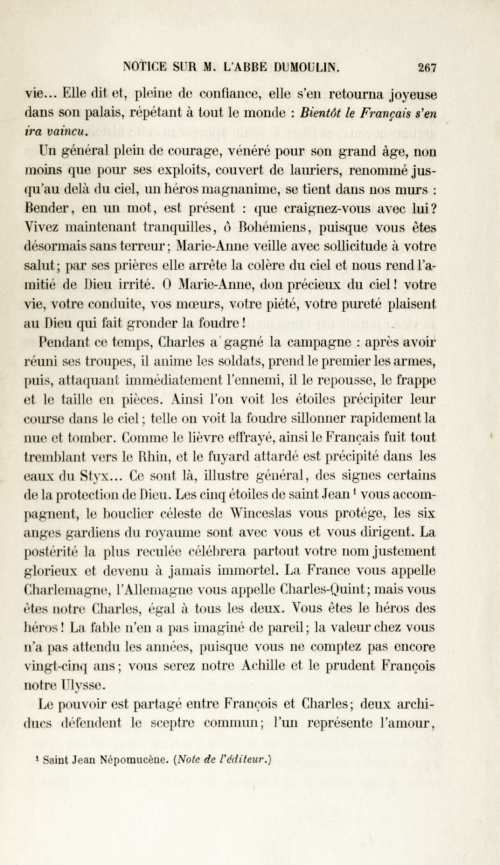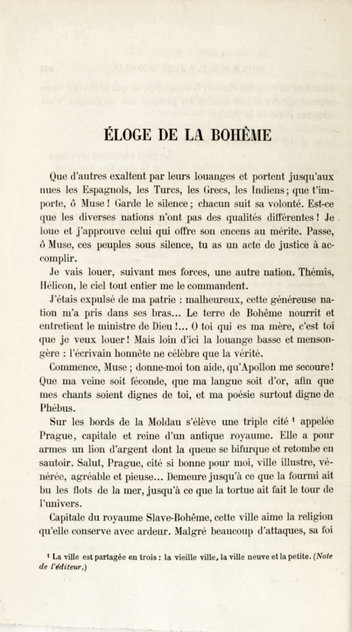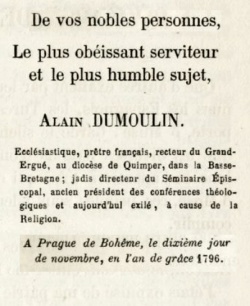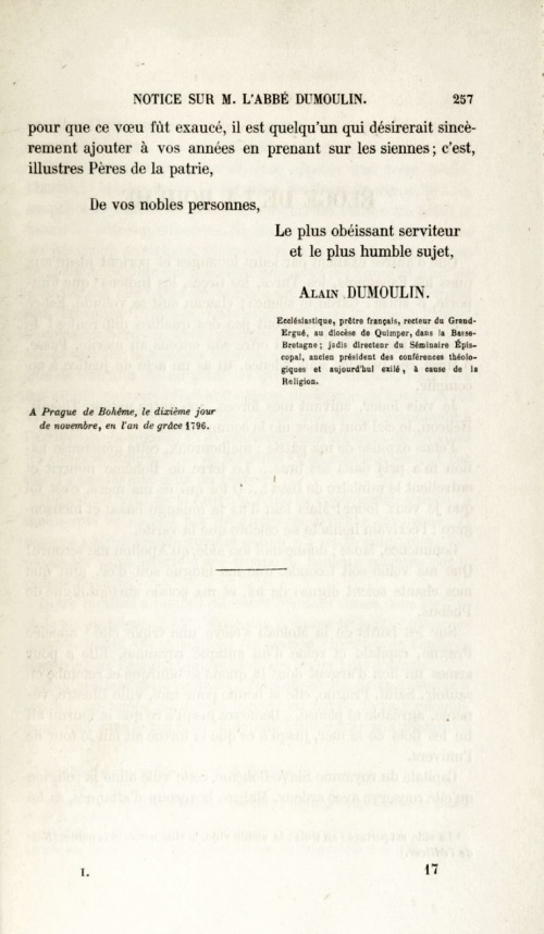 Le titre complet en latin du livret est « Ecomium regni Bohemiae Genti Bohemicae dedicatum sub auspiciis Celeberrimorum nec non nobilissimorum regni Statuum », à savoir « Eloge du Royaume de Bohême dédié à la Nation Bohémienne sous les auspices des très-illustres et Très-nobles seigneurs des Etats du Royaume ». Le texte latin a été traduit en français par l'abbé Joseph-Marie Téphany dans sa notice sur Alain Dumoulin, incluse dans son ouvrage consacré à la « Vie de Mgr Joseph-Marie Graveran, évêque de Quimper et de Léon ». Il commence ainsi : « J'étais expulsé de ma patrie : malheureux, cette généreuse nation m'a pris dans ses bras ... La terre de Bohême nourrit et entretient le ministre de Dieu ! ... O toi qui es ma mère, c'est toi que je veux louer ! Mais loin d'ici la louange basse et mensongère : l'écrivain honnête ne célèbre que la vérité ». En conclusion le prélat répète son principe de vérité : « J'ai payé, par ce chant, une dette de reconnaissance ; si - ce qu'à Dieu ne plaise ! - mes vers ne trouvaient pas de suffrages, je me consolerais cependant, parce que j'ai dit la vérité et que je l'ai dite avec un coeur vrai et sincère. Je ne m'abaisserai jamais à louer le vice ; jamais ma muse ne pourra chanter ou supporter les méchants ; jamais on ne me verra donner mon encens à ceux qui en sont indignes. ». Autres lectures : « Alain Dumoulin (1748-1811), prêtre et écrivain » ¤ « TÉPHANY Joseph-Marie - Notice sur M. l'abbé Dumoulin émigré en Bohême » ¤ « Alain Dumoulin, Biographie bretonne de P. Levot » ¤ « Alan Dumoulin (1748-1811) gant Loeiz Lokournan, Arvor 1947 » ¤ « Grammaire latine et bretonne de Dumoulin (Prague, 1800) » ¤ « ROUZ Bernez - Alain Dumoulin dans la tourmente révolutionnaire » ¤ « La légende de Torr-è-benn par un prêtre gabéricois » ¤ « Une gwerz satirique en breton contre les aérostats en 1800 » ¤ « LE ROY Thierry - Les pionniers de l'aviation et de l'aérostation » ¤ | |||||