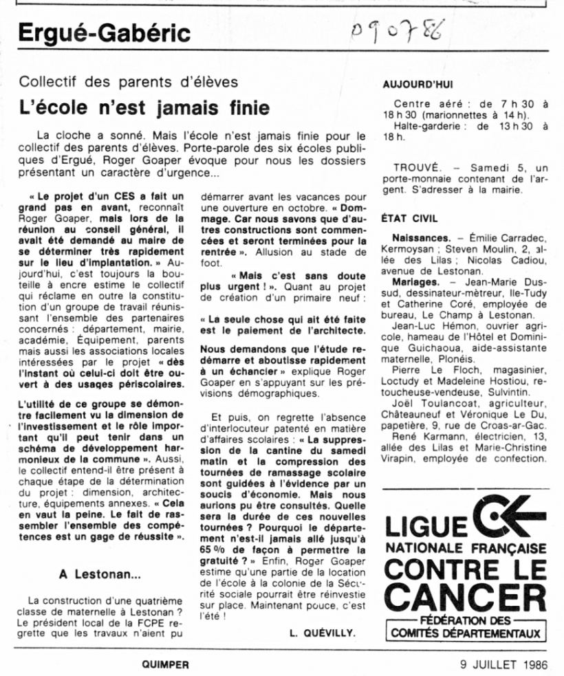 | Le 18 janvier, le 19 mars, le 9 juin, le 9 juillet 1986 paraissaient dans les colonnes du Ouest-France des articles de Laurent Quevilly sur la vie dans les écoles de la commune.