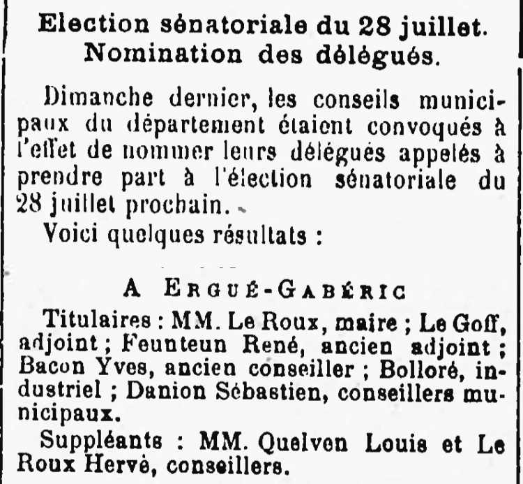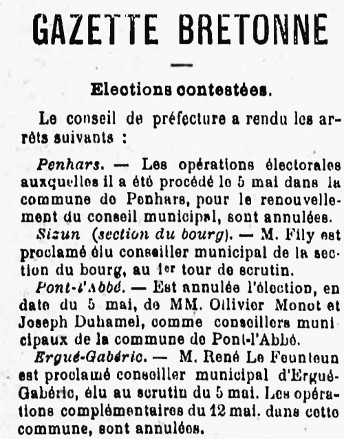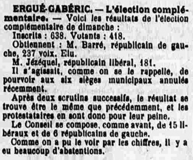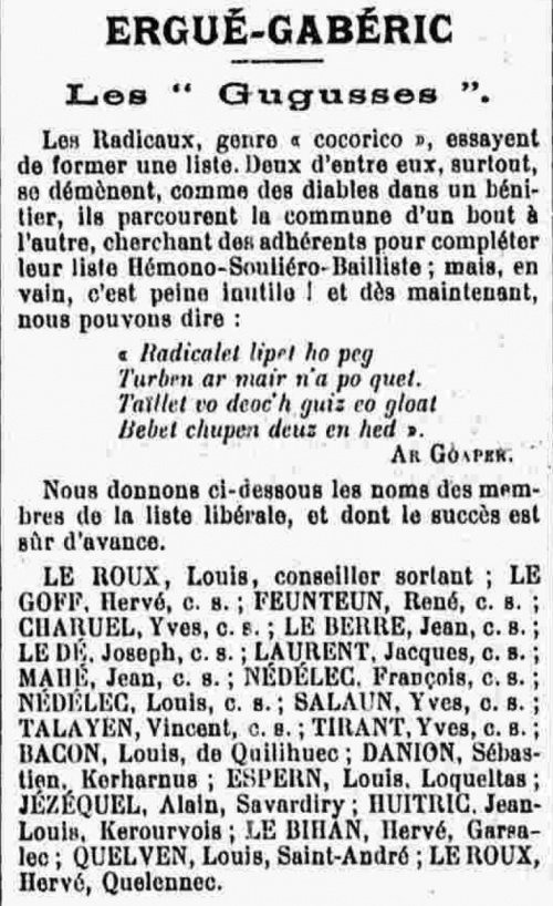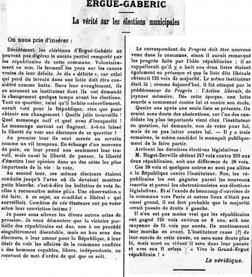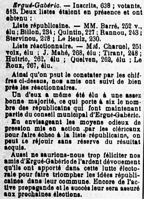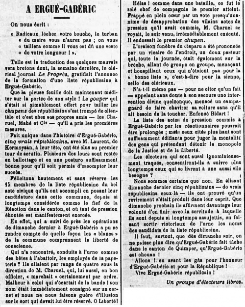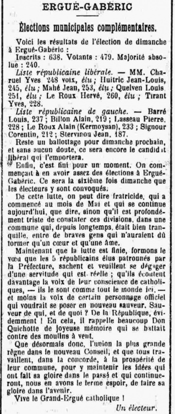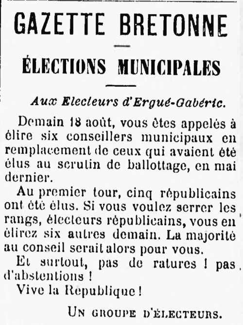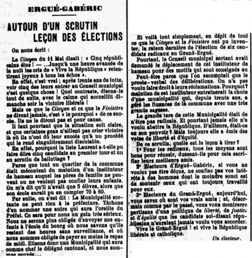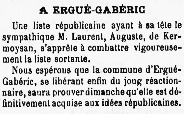 Nous espérons que la commune d'Ergué-Gabéric, se libérant enfin du joug réactionnaire, saura prouver dimanche qu'elle est définitivement acquise aux idées républicaines.
