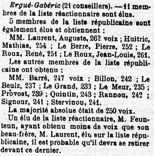 Fait unique dans l'histoire d'Ergué-Gabéric, cinq vrais républicains, avec M. Laurent, de Kermoysan, à leur tête, ont été élus au premier tour de scrutin. Plusieurs des leurs sont restés en ballotage et en une posture suffisamment bonne pour qu'il soit permis d'escompteur leur succès.