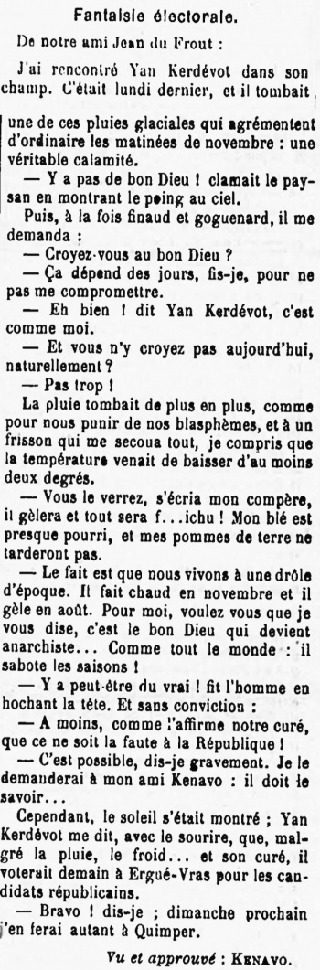 Cependant, le soleil s'était montré ; Yan Kerdévot me dit, avec le sourire, que, malgré la pluie, le froid ... et son curé, il voterait demain à Ergué-Vras pour les candidats républicains.
