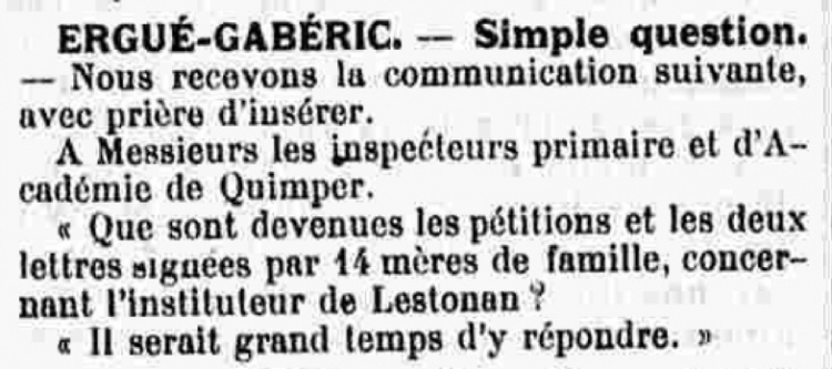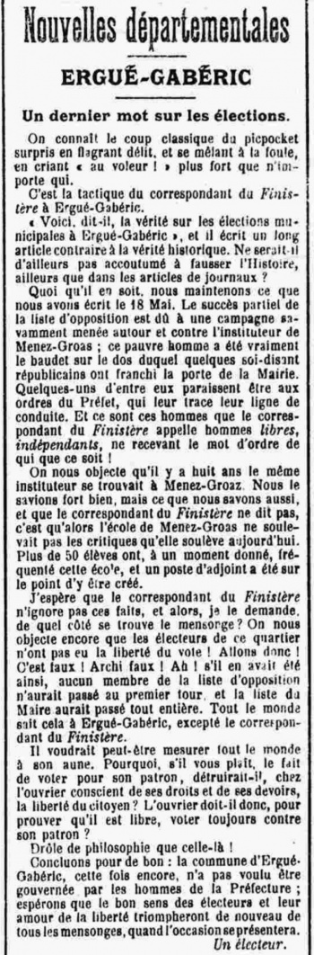 Décidément, les cléricaux d'Ergué-Gabéric ne peuvent pas digérer le succès partiel remporté par les républicains de cette commune. Volontairement ou non, ils ferment les yeux sur les causes vraies de leur défaite. Je dis "défaite", car celui qui perd du terrain dans une lutte doit être considéré comme battu. Dans leur aveuglement, ils en accusent un instituteur dont ils ont demandé le changement quelque temps avant les élections. Tout un quartier, celui qu'il habite naturellement, aurait voté pour la République, rien que pour obtenir son changement !