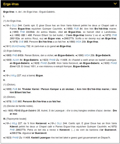 Les 14 variantes unitaires différentes sont ordonnées suivant les dates de leurs relevés pendant tout le 19e siècle et le début du 20e siècle. Pour chaque occurrence la référence écrite précise, soit une publication reliée ou des feuilles volantes, est présentée sous forme d'une abréviation inscrite dans un corpus et d'une pagination / numérotation. Ainsi, le corpus inclut essentiellement des livres de collectages de chansons et expressions populaires (OLLI, FUB, GBI ...) , et des journaux entièrement en breton comme le « Feiz ha Breiz » (FHB pour la période 1865-1884 et FHAB pour 1900-1943), ou des almanachs. La recherche du nom communal dans ces sources a permis aussi de compiler des dictons ou chansonnettes comme « TRIVEDER KERNE : Person Kemper a zô skolaer, / Ann hini Erc’hié-Vrâz marrer, ... » (TRIADE DE CORNOUAILLE : Le recteur de Quimper est instituteur, / Celui du Grand-Ergué, écobueur). Et cette recherche sert aussi à présenter les deux toponymes de Kerdévot et de Lezergué : « Kastell Lezergue n'eo ket bet laket e gwerz gant gouarnamant an Dispac'h ... » (Le château de Lezergué n'a pas été mis en vente par le gouvernement de la Révolution). |
