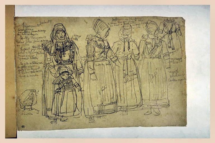 L'article de Denise Delouche constitue une étude très intéressante des dessins signés Eugène Boudin, peintre normand qui vint au pardon de Kerdévot dans les années 1855-57. Ces croquis sont conservés au Cabinet des Dessins du Louvre, et seraient datés des années d'avant 1860. Eugène Boudin a exposé en 1858 pour la Société des Amis des Arts du Havre un tableau intitulé « un Pardon près de Quimper » A noter les livres de référence de Denise Delouche : "Eugène Boudin et la Bretagne" , "Eugène Boudin, dessins", et l'article sur les traditions du pardon : Le pardon de ND de Kerdévot. Les 16 dessins localisés à Kerdévot par l'auteur et les 7 autres supposés sont disponibles sur le site http://http://arts-graphiques.louvre.fr (cf vignettes ci-dessous ou sous forme d'un diaporama : [cliquer ici]). Notes :