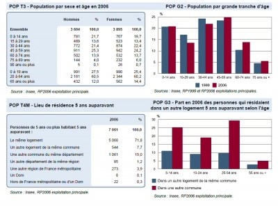 Source : Site de l'Insee Plus de 80 tableaux fournissent des résultats détaillés couvrant l'ensemble des thèmes du recensement de la population. Ils sont disponibles, à partir de 2 000 habitants, pour les communes, les arrondissements municipaux de Paris, Lyon et Marseille, et les territoires standard constitués de communes entières (arrondissements, départements, régions, zones d'emploi, unités urbaines...). Jusqu'à trois versions, plus ou moins détaillées, sont proposées selon la taille de la population du territoire. | ||