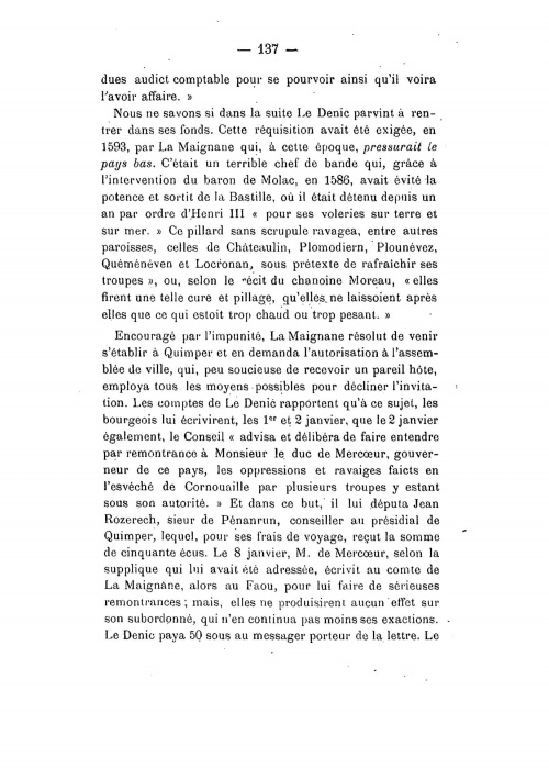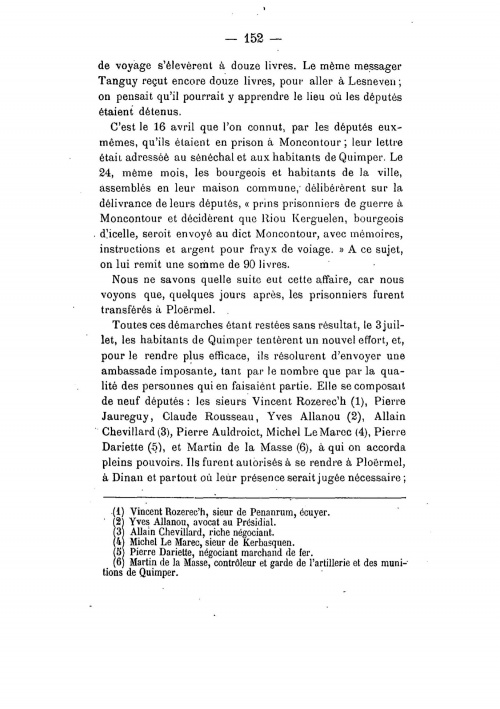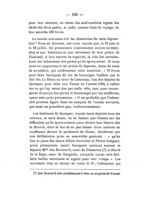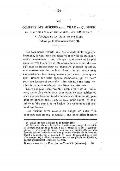 On l'appelait le Commandant ou le Major Faty, et il fut très actif en tant que retraité érudit quimpérois. Il a publié notamment cet article de 83 pages paru dans le Bulletin de la Société Archéologique du Finistère de 1885 où il présente ses relevés des comptes de miseurs de Quimper. Un miseur, dans les grandes villes bretonnes du 15e au 18e siècle comme Nantes, Lamballe, Vitré, Quimper, Vannes et Rennes, est un comptable chargé des comptes municipaux, des recettes et des autorisations de dépenses. Pour Quimper on dispose de ces comptes de miseurs pour les années 1478 à 1785. En 1594-97 on est encore en pleine période de guerre de la Ligue en Bretagne, à savoir la révolte nobiliaire et urbaine autour du duc de Mercoeur Dans l'étude du commandant Faty, on trouve les passages des comptes de miseurs de Quimper en 1594 qui attestent des « paiements d'anciens biens/gens Les Rozerc'h de Penanrun font partie de ces députés envoyés auprès du duc de Mercoeur Et page 152 il est question d'un parent ou frère de Jan Rozerc'h, à savoir Vincent Rozerc'h : « Le 3 juillet, les habitants de Quimper tentèrent un nouvel effort, et pour le rendre plus efficace, ils résolurent d'envoyer une ambassade importante, tant par le nombre que par la qualité des personnes qui en faisaient partie. Elle se composait de neuf députés : les sieurs Vincent Rozerec'h, Pierre Jaureguy ... ». Nous avons rassemblé les fac-similés de toutes pages des comptes des miseurs, conservés aux Archives municipales de Quimper, qui relatent ces faits, afin d'en faire une transcription littérale et analyser plus précisément la généalogie des Rozerc'h : « 1594 - Les Rozerc'h de Penanrun dans les comptes de miseurs de Quimper » ¤ Référence FATY/SAF : « Media:ComptesMiseursFaty-BSAF1885.pdf », et extractions jpeg ci-dessous de quelques pages. Autres lectures : « FATY Bruno - Le retable de Notre-Dame de Kerdévot » ¤ « 1594 - Les Rozerc'h de Penanrun dans les comptes de miseurs de Quimper » ¤ « 1617 - Minu et déclarations des terres de Pennarun par Marie Coznoual veuve Rozerc'h » ¤ « FINISTÈRE Société Archéologique (du) - Bulletins annuels » ¤ | ||||||||||