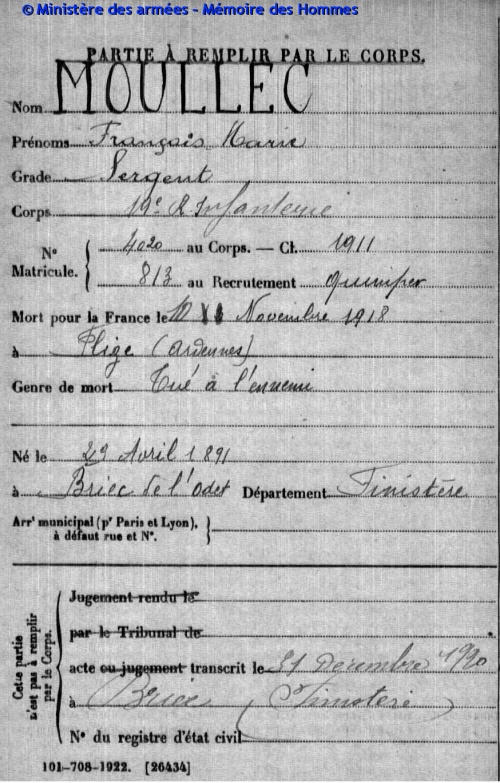 Et LE GUILLOU Jeanne Marie, Ouvrière, (majeure), née le 02/05/1899 à Briec, fille de Jean Louis, décédé et de Jeanne LIJOUR, Ménagère , présente, Veuve de : François Marie MOULLEC, décédé le 12/11/1918. Notes épouse : domiciliée à Ergué-Gabéric ; elle signe ; son premier mari est Mort pour la France aux armées à Flize. Témoins : Hervé MEVELLEC, 52, cult, Briec, s -- Jean le MOIGNE, 23, ouvrier électricien, Quimper, s [Ref.↑] - Page 453 du livre-mémoire « Un ouvrier-artisan en guerre, Les témoignages de Gaston Mourlot 1914 – 1919 », collectif CRID, Edhisto, 2012. [Ref.↑]