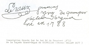 D'après Pierre Guillot (« Dictionnaire des organistes français des 19 et 20e siècles ») : Par rapport au texte ci-dessus on notera les éléments complémentaires suivants : Sa naissance au manoir de Kernaou, ou plutôt dans la ferme ex-manoriale, est attestée par son acte de baptême le 17.02.1788, et également dans le recensement de la population en 1790. Son père, issu d'une famille originaire de Cre'ch-Ergué, est décédé début 1788 à Kernaon, quelques jours après la naissance de Fançois-Yves (sur l'acte il est déclaré absent et malade). Cette année-là le frère de François-Yves, de 3 ans son aîné, va également mourir. Sa mère, sans doute placée comme domestique à Kernaou pour subvenir à leurs besoins, se remariera avec l'agriculteur tenant l'exploitation. François-Yves est décédé le 30.07.1838 au Bourg de Guimiliau à l'âge de 50 ans, et sous le prénom François-Marie et non François-Yves. Dès son mariage à 33 ans en 1821 avec Marie Hélène Maguet (née à Guimiliau) il est déclaré organiste de profession. L'orgue de Guimiliau a été construit dans les années 1675-80 par le facteur Thomas Dallam, tout comme celui de dimension plus modeste d'Ergué-Gabéric. En 1850 : l'orgue, muet depuis quelques temps, est remis en état par Loiselot et par l'organiste Maryvonne Le Roux qui avait pris la suite de son père. |