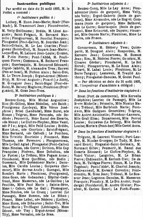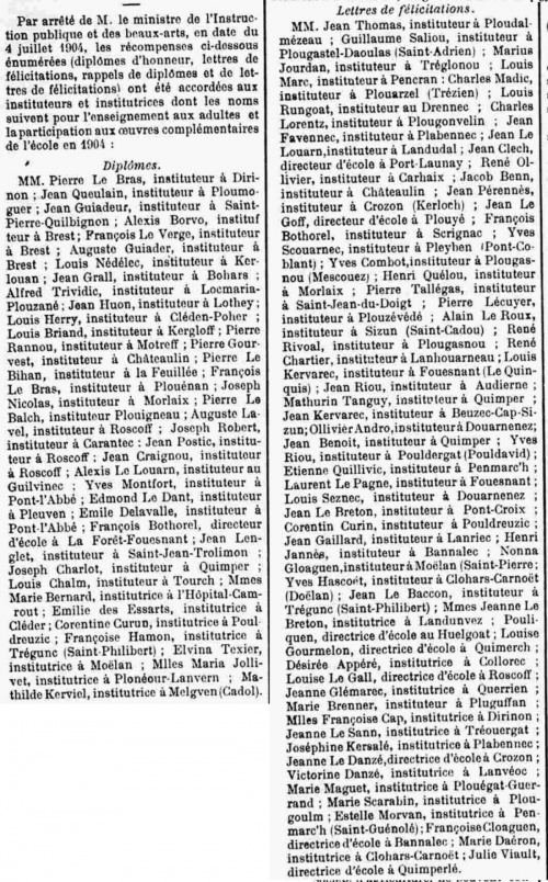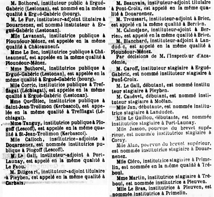 Autres lectures : « Espace "Les Instits" » ¤ « Un grand mariage breton à Squividan, Le Petit Journal et Finistère 1892 » ¤ « Grand concours de tir à Ergué-Gabéric, Le Finistère 1895 » ¤ « Les institutrices et instituteurs en poste à Ergué-Gabéric » ¤ « AC'H François et RAULT Roger - Les écoles publiques de Lestonan, 1880-1930 » ¤ | ||||||||||||||||||