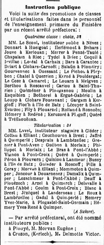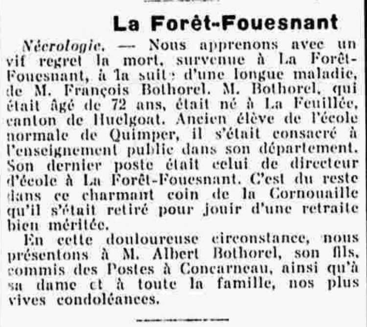 François Bothorel, fils d'épicier, est né le 9 novembre 1863 à La Feuillée Il est nommé instituteur de la classe unique des garçons de l'école communale de Lestonan de mars 1889 à février 1890, et son épouse institutrice à l'école des filles. Ils sont nommés en 1891 à l'école des garçons du bourg, François avec le poste de directeur et y restent jusqu'à l'été 1895. Ils auront au moins un fils, Albert, qui deviendra commis des postes à Concarneau. En septembre 1892 ils sont nommés à Commana. En 1904 ils sont à Scrignac et François est récompensé par un « diplôme d'honneur de l'Instruction publique ». En 1912 ils sont mutés de Scrignac à Plomodiern, et seront ensuite nommés à la Foret-Fouesnant. François décède en janvier 1936 à la Foret-Fouesnant « des suites d'une longue maladie ». |