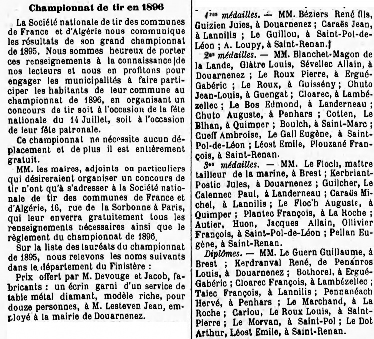 On retrouve parmi les lauréats ayant obtenu le maximum de points (25) les frères Auguste et Jean-Louis Chuto, le premier étant "candidat-maire" de Penhars, et le second domicilié à St-Alouarn en Guenguat. Les deux frères seront aussi, pour cette année 1895, médaillés par la Société nationale de tir des communes de France et d'Algérie (Union agricole, 07.1896). Pour Penhars, Hervé Pennanec'h, beau-frère d'Auguste Chuto, fait 24 points, et sa médaille a été retrouvée par son arrière petite-fille :