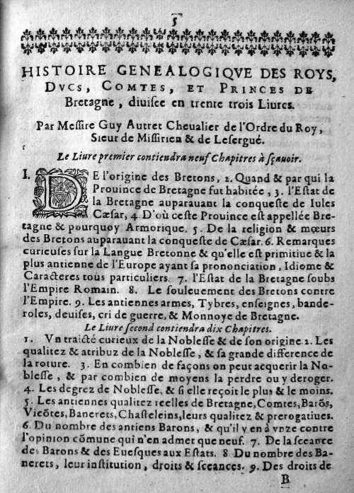Il édita en 1655 une « Vie de saint Joachim », en y ajoutant une litanie du saint et des prières pour le Roi. Dans une lettre du 31 janvier 1655 à Pierre d'Hozier En cette même année 1655, il publie son « Dessein et projet de l'histoire généalogique de Bretagne ». Cette Histoire généalogique de Bretagne ne restera sous la forme de projet et d'ébauches de généalogies sous forme manuscrites. Le texte publié est écrit avec un style et une envolée lyrique : « Entre toutes les estudes, j'ay heureusement fait eslection de celle de l'Histoire, comme la plus convenable à ma profession & à mes inclinations ; j'ay crû que la recherche des Antiquitez estoit incomparablement plus utile que celle des Tulipes & des Peintures, qui me flatent & ne contentent que les yeux & les sens, au lieu que l'Histoire est un solide aliment de l'esprit qui entretient & delecte si agreablement ceux qui l'ont une fois savourée, qu'ils s'y attachent apres par delices, avec des affections & des ravissements incroyables. ». |