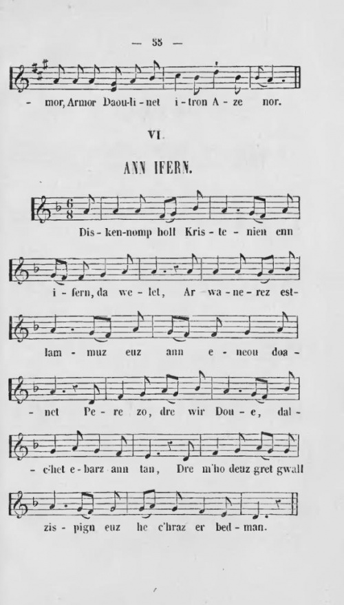 | Voici un célèbre cantique, figurant dans le Barzaz Breiz de Théodore Hersart de la Villemarqué, qui fut un des cantiques les plus populaires chantés dans les églises et chapelles bretonnes depuis des siècles, et dont les 24 strophes furent publiées en 1805 par le recteur gabéricois Alain Dumoulin (1748-1811).
